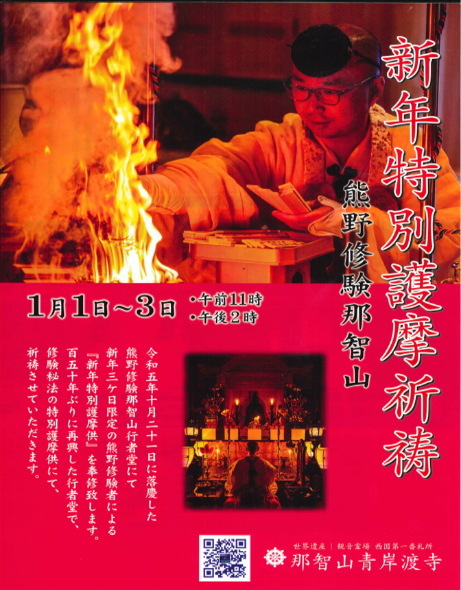 熊野修験那智山行者堂にて新年三ヶ日限定の熊野修験者による『 新年特別護摩供』を奉修致します。三が日限定で、 内陣特別参拝も行います(参拝無料)