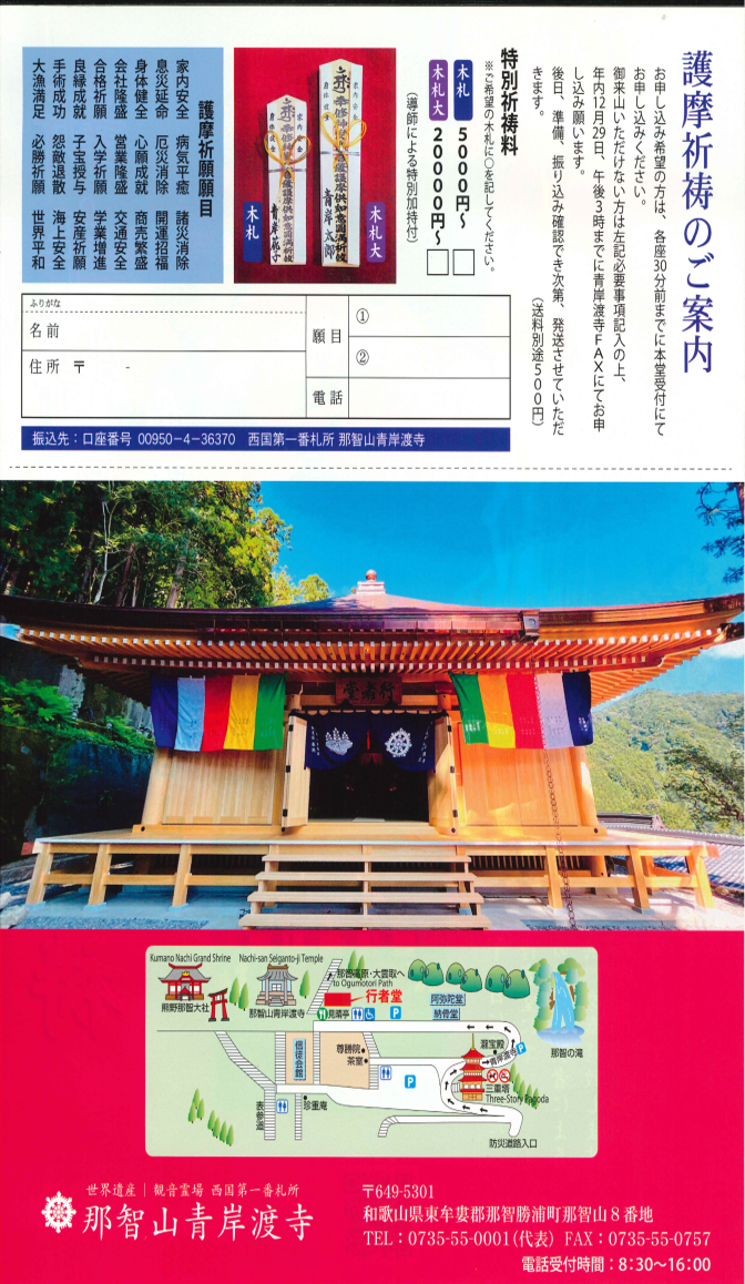 年内29日午後3時までに青岸渡寺FAX(0735-55- 0757)にて、案内記載の必要事項と木札の種類記載の上、 お申し込み願います。